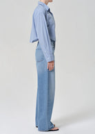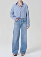 The Ayla jean offers a refined take on the baggy silhouette with a relaxed fit that sits away from the body while maintaining a clean, intentional shape. The "Cupid" wash is a medium to light indigo denim pant with fading, whiskering. Crafted from rigid regenerative cotton with a soft hand, it styles effortlessly with everything from crisp shirting to slim knits.