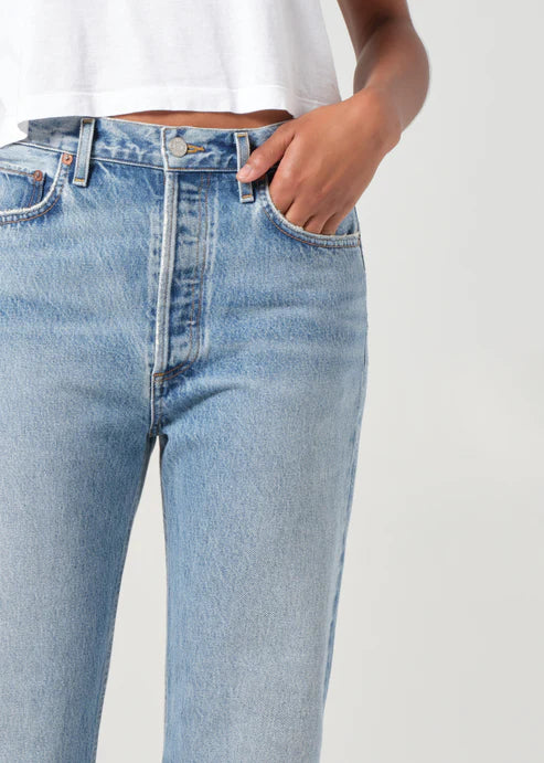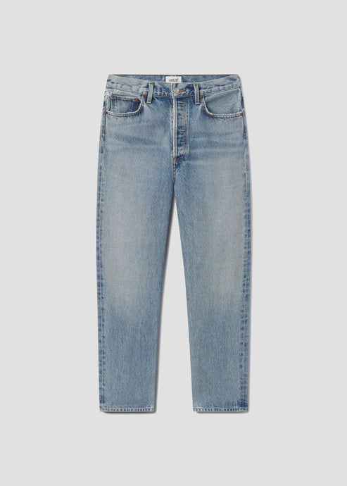 With a marbled, worn-in indigo wash and soft whiskering, this full-length high-rise straight channels effortless vintage appeal. Crafted from rigid, non-stretch regenerative cotton denim, it offers a structured fit that softens over time. Style it with a crisp button-down for a refined daytime look