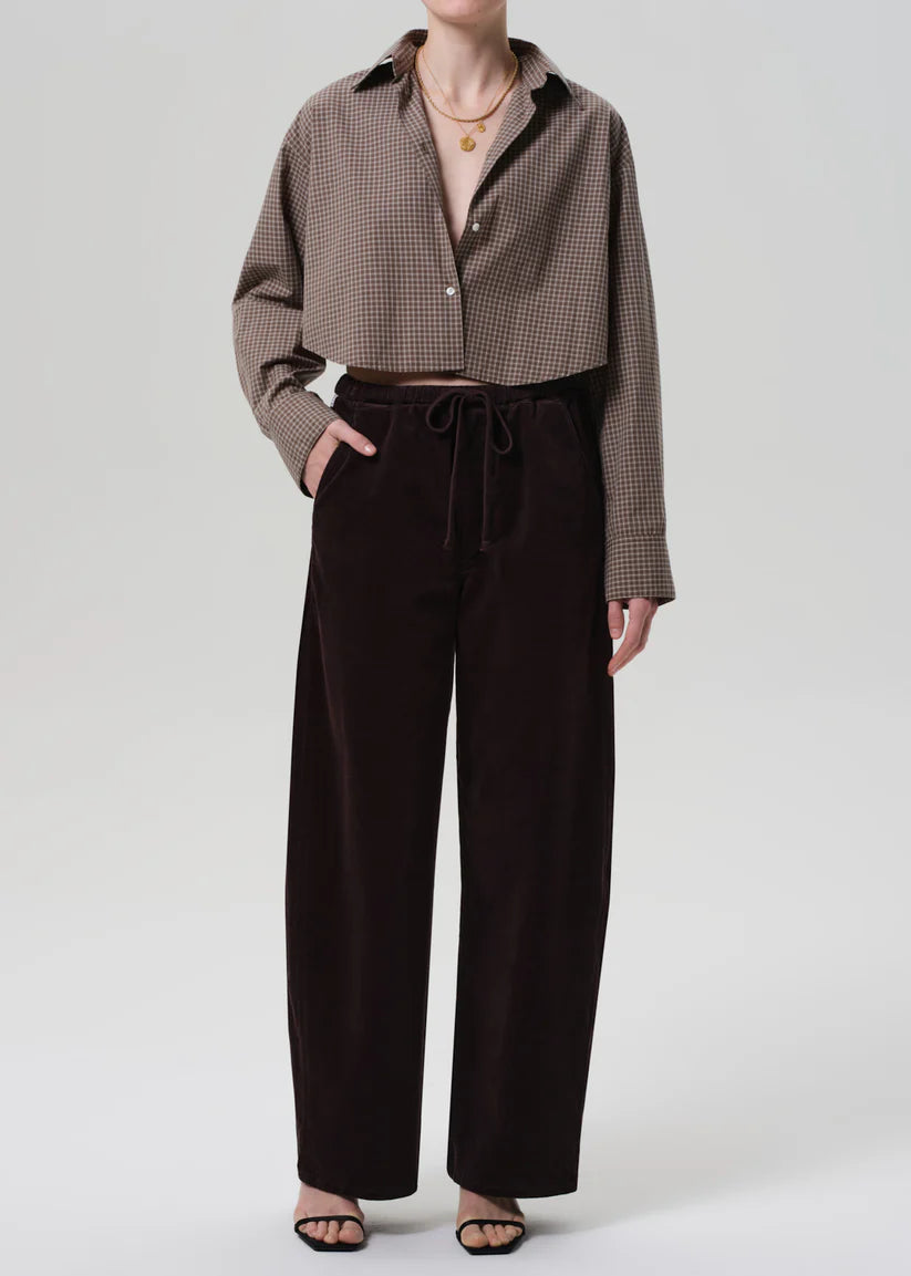 A modern staple with a vintage nod, the Ana shirt is cut from ultra-lightweight Japanese cotton with an airy feel. The cropped silhouette and pointed collar lend sharp structure, while the dark brown and grey micro plaid adds subtle depth. Effortless layered or worn solo with high-rise denim or relaxed trousers.