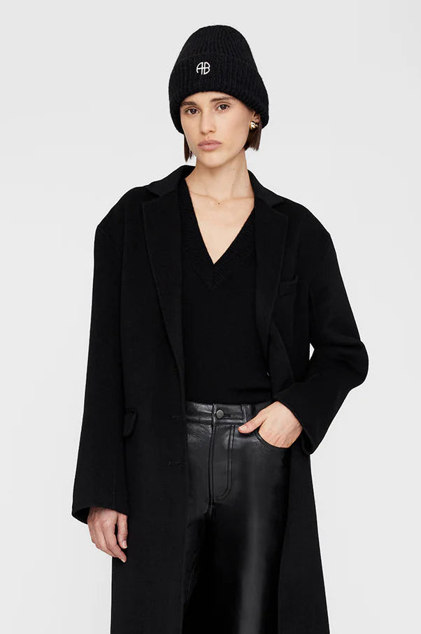 A cold-weather accessory made from a luxurious alpaca-wool yarn with all-over, vertical cardigan-stitch detailing. Its folded brim is finished with a small leather patch debossed with ANINE BING branding.