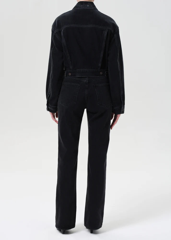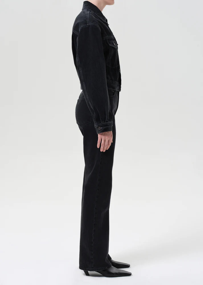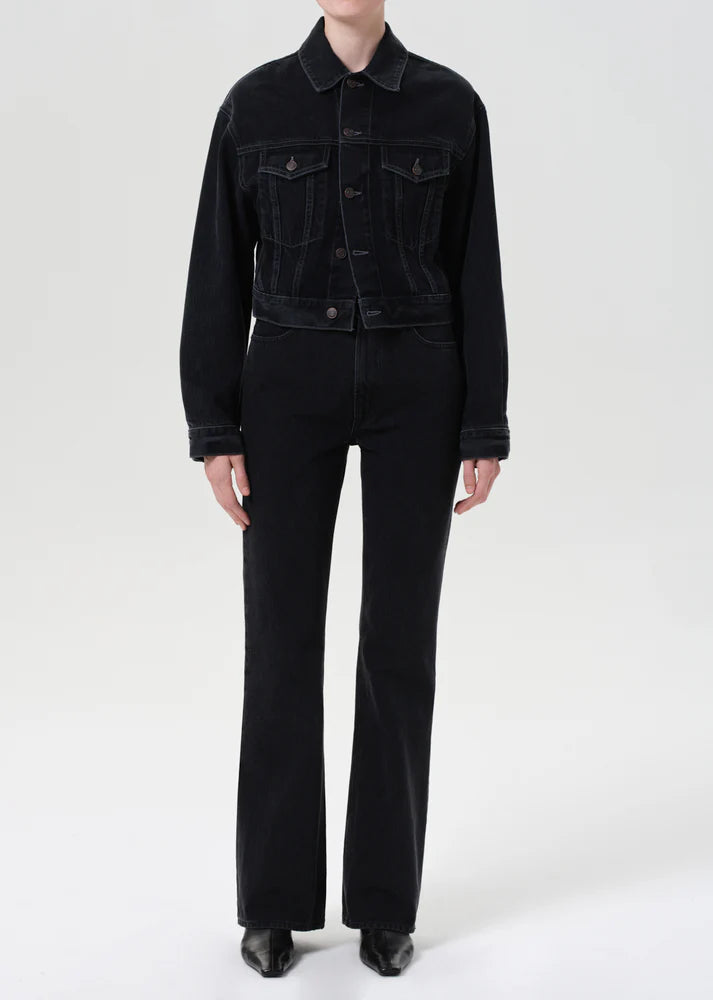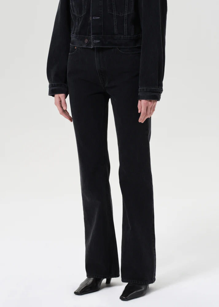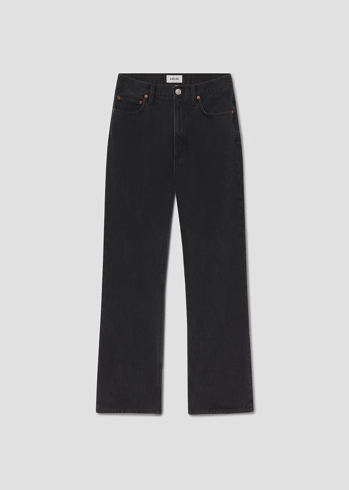 A flattering high-rise flare with an elongated leg, the Leena is cut from rigid, non-stretch denim crafted with organic and recycled fibers for a structured yet soft feel. This pair is finished in a washed-out black with warm undertones and subtle fading for a broken-in effect. Style with a crisp white tee or oversized blazer for a clean, tonal look.