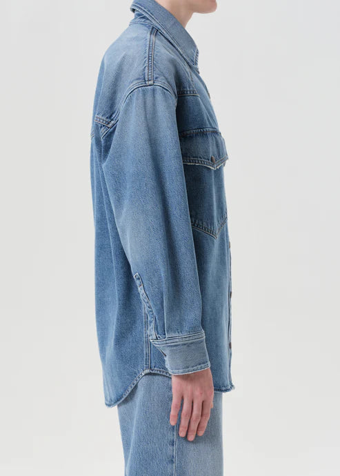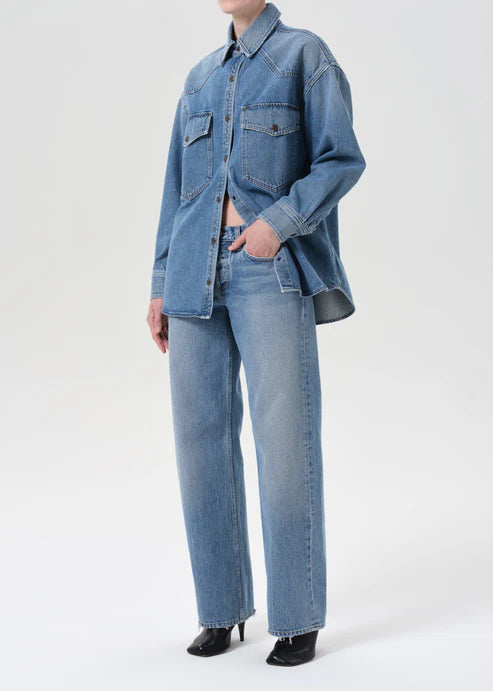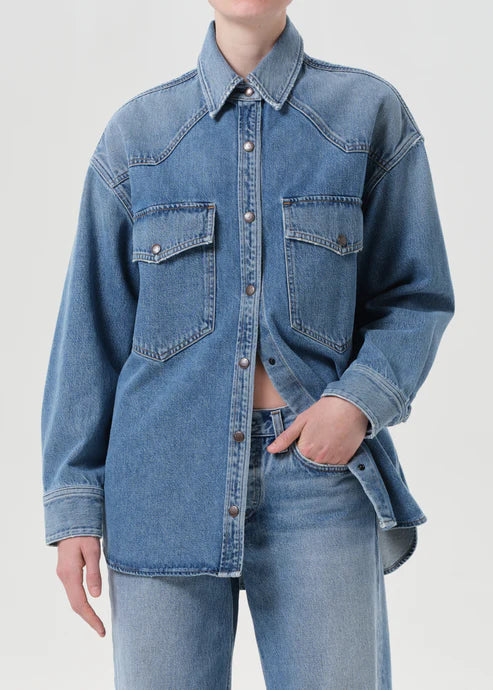 The Lotta Shirt is a structured denim staple with a nod to Western shirting. Featuring a pointed yoke, snap button closure, and flap pockets, this medium indigo wash is crafted from rigid regenerative cotton for a heritage-inspired, clean look. Wear it open over a tee or buttoned-up for a polished take on classic denim.