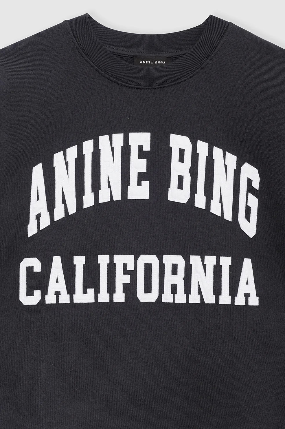 The Miles Sweatshirt ANINE BING is an oversized crewneck pullover made from midweight 100% organic cotton fleece in a vintage black wash. This relaxed casual features an original ANINE BING felt patch graphic at the chest in contrast white authentic collegiate lettering.