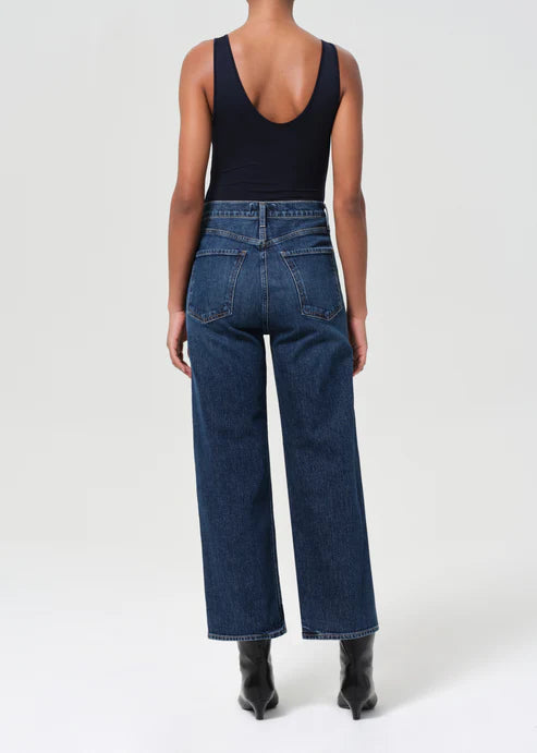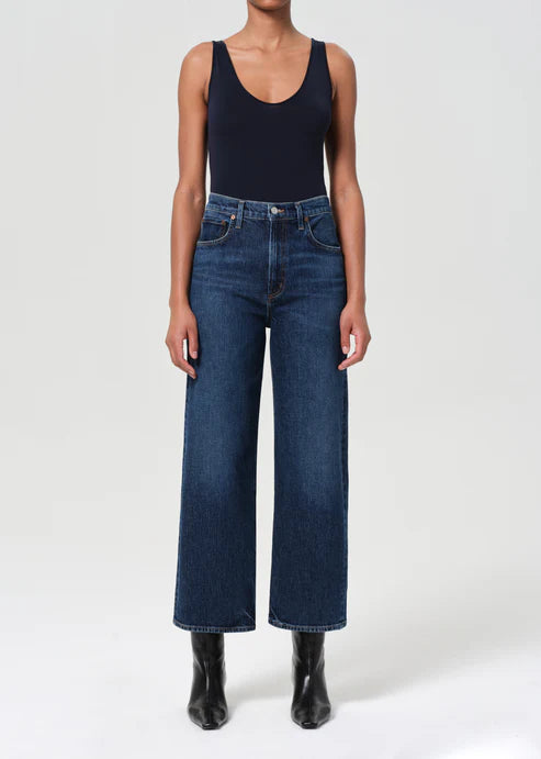 AGOLDE's Ren jeans are crafted from recycled cotton, offering a relaxed fit with a high-rise waist and cropped wide legs. These jeans are perfect for casual days, combining comfort with style. Pair them with a half-tucked tee or sleek bodysuit for an effortlessly chic look.