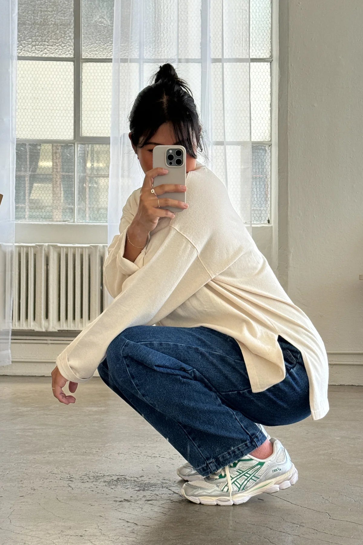 Sometimes we love to borrow things from our beau's closet to create a fun and effortless look. Sunday Tee is inspired by menswear classic long sleeve tee. Subtle yet playful high side slit transform this simple piece into a fun closet staple. Sleeves are wide enough to roll up! She pairs beautifully with our Balloon Pants, and also loves to be styled with gingham and denim bottoms. You can also take her with you on all your summer getaways as Sunday tee makes the best sophisticated coverup for your ????