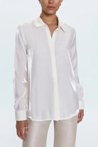 A timeless button-up, Tilda features a relaxed fit and long sleeves that balance soft structure with modern ease. Designed with a pointed collar and subtle sheen for quiet polish. Crafted from a smooth woven blend in Ecru, a clean neutral that transitions seamlessly from day to night.